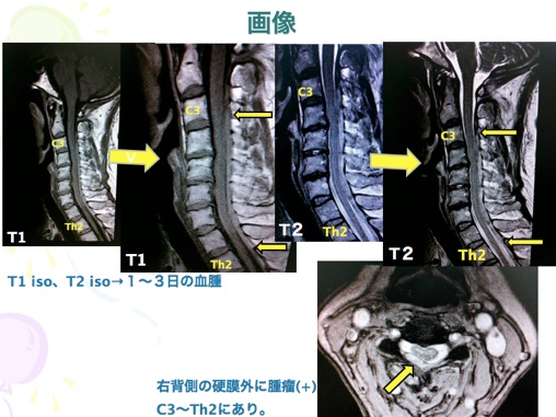同時に横(ルート)と縦の症状がおこっており、結構広範囲に根症状も起こして得るのは、長い髄外病変しかなさそう。