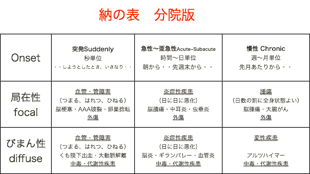 突然発症で、短期間で局所症状完成しており、以下の表からやはり血管病変が疑わしい。